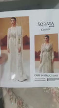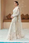 Anya is a handcrafted artistic piece dipped in a white hue celebrating the glory of wedding festivities. A glamoured organza paneled long shirt executed with touches of pink floral 3D work and katdana over the whole canvas further glorified with sequenced pearls and crystals reviving the bridal beauty. It is paired with a magnificent raw silk pants designed with small motifs over it and a gleaming net dupatta finished with scalloped organza crafting a quintessential romantic piece to perfection.