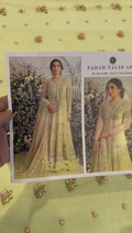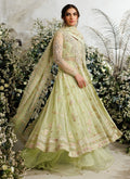 The sheer, kiwi green net kalidaar is layered over a shimmering strappy bustier, also heavily hand worked.